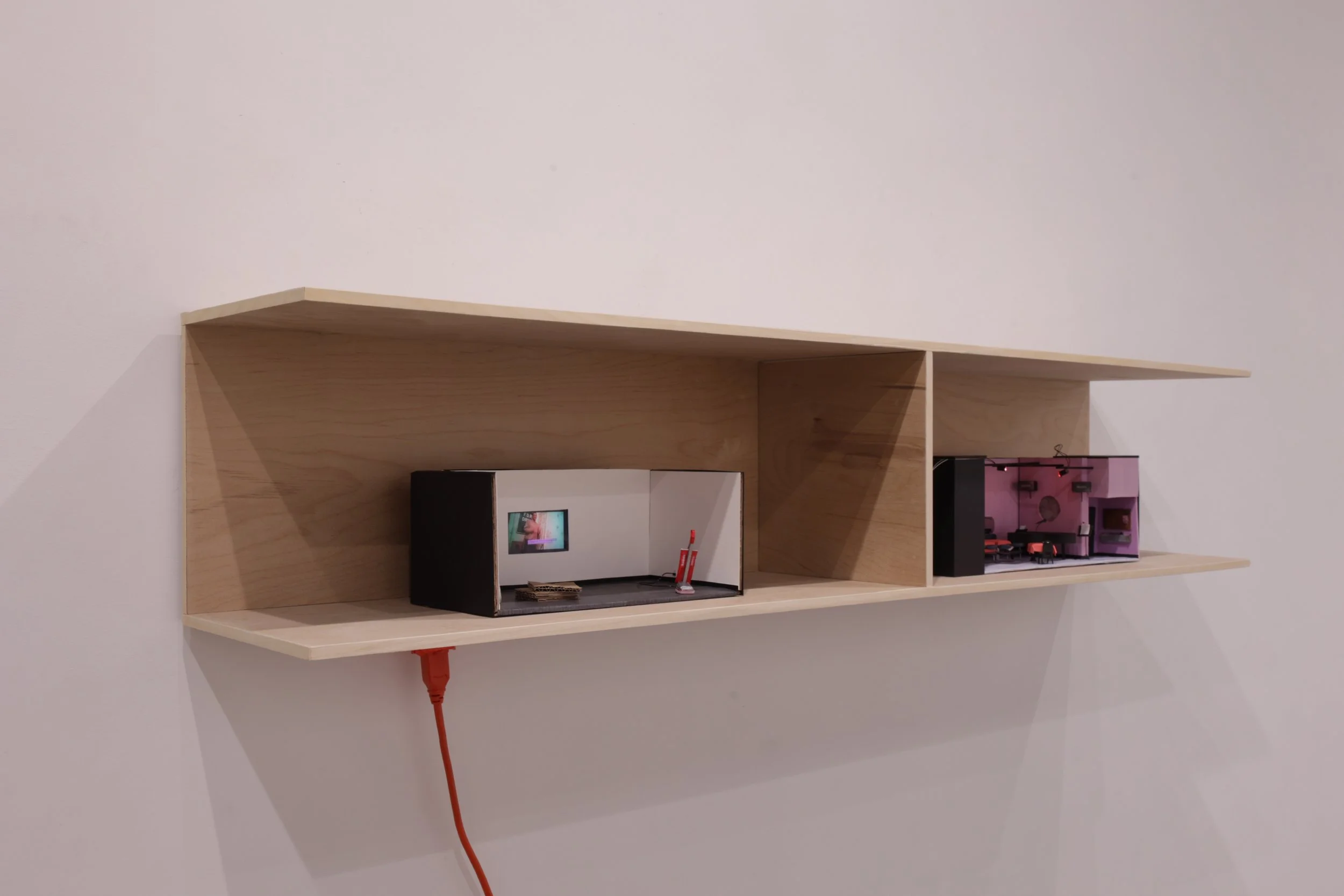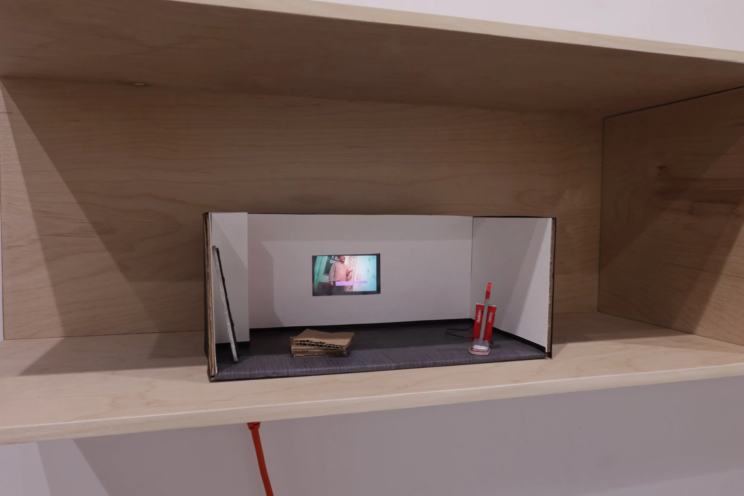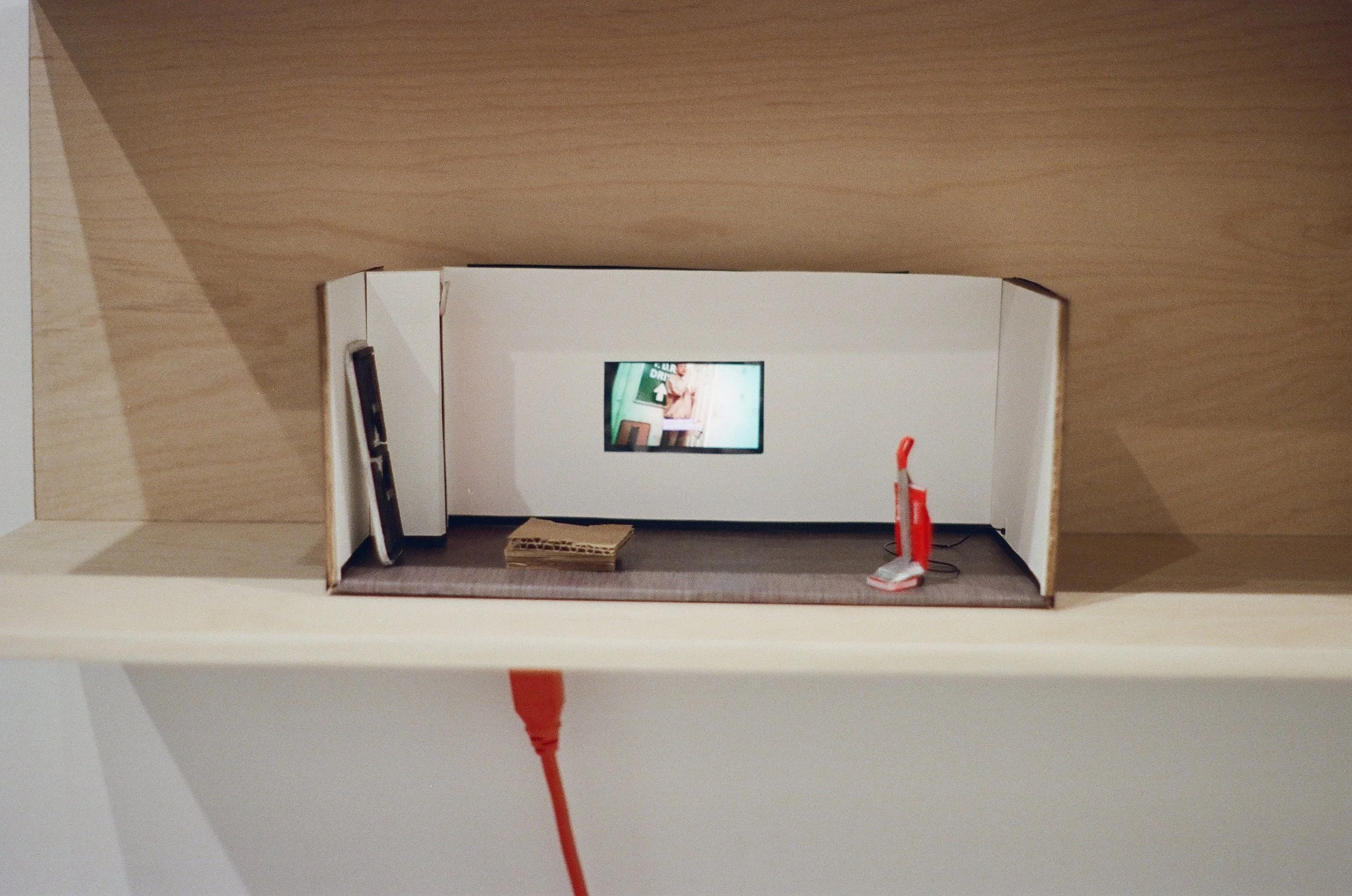 Acrylic paint, cardboard, colored pencil, paper, plastic, printed image, ink, single channel video, wire